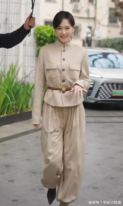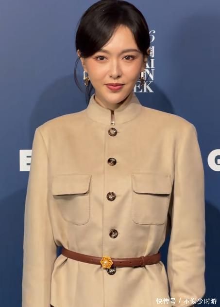 她身穿卡其色工装风立领套装,立体剪裁精确贴合腰臀弧线,短发造型干净利落,温婉知性的东方气质跃然咫尺。
