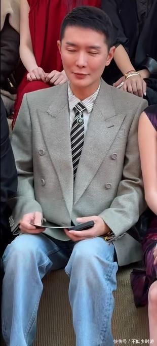 他身着一套深灰调高定西装,肩线利落、腰围收束,内搭真丝晴明衬衫,领口两粒扣削弱,慵懒中透出专科泰斗感,整套造型精确呼应当时尚媒体掌舵东说念主的身份定位。